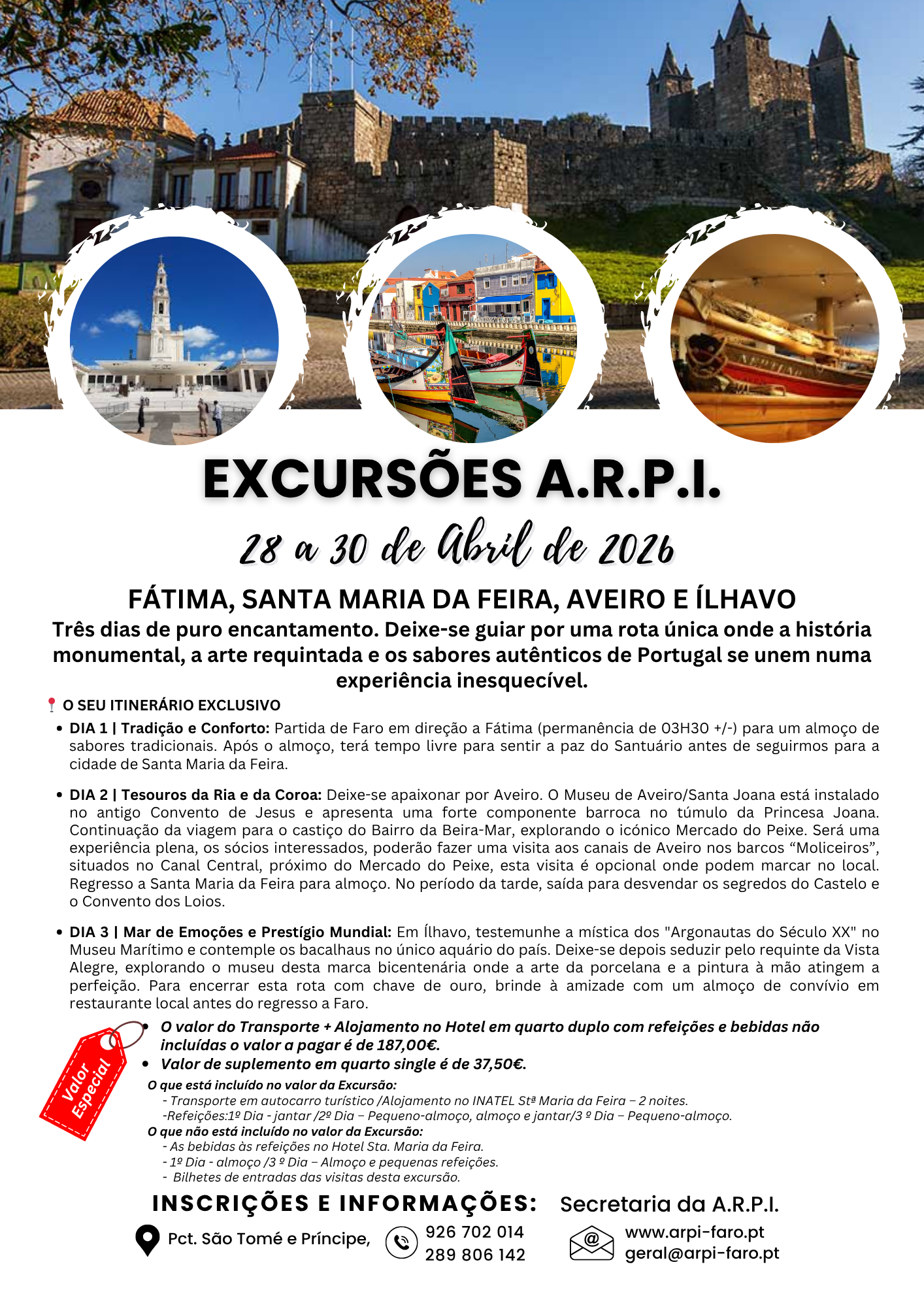 ARPI Praceta São Tomé e Príncipe, Faro, Faro, Portugal28 a 30 de Abril de 2026 FÁTIMA, SANTA MARIA DA FEIRA, AVEIRO E ÍLHAVO Três dias de puro encantamento. Deixe-se guiar por uma rota única […]